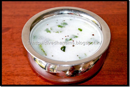 Neer Moru is a very tasty and soothing drink. It is made on Rama Navami which falls on 20.4.2013 this year. It is a quick one and can be done in less than 10 minutes. It tastes best when served cold.. It is very healthy and is a body coolant. It is generally served during summer.