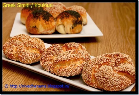 Yayy!!! My 400th post!!! Thanks to all who have supported me and looking forward for the same in future... So to today's recipe - Simiti is the breakfast bread served in many places in Greek. These simiti are the breakfast choice of the Athenians.. These are irresistible... From Little Expat Kitchen – “The Greek word simiti/σιμίτι (plural: simitia/σιμίτια), comes from the Turkish word simit, which comes from the Arabic word semid, which in turn comes from the ancient Greek word semidalis/σεμίδαλις (simigdali/σιμιγδάλι in modern Greek), meaning semolina”. We loved the texture of the bread and also the flavor the sesame seeds and the grape syrup!! I have never heard of this bread before until Gayathri announced this as a challenge for this month's Eggless Baking Group from here.. It was sure a great learning and so excited that I tried it!!